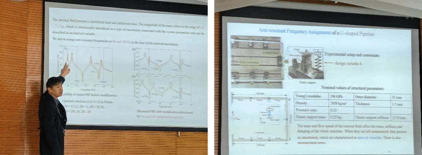 首先,Ouyang Huajiang教授从基础振动理论入手,由浅入深地介绍了结构动力学模态参数、模型修正、极点配置、被动控制等多方面理论知识。随后结合其在英国利物浦大学课题团队所做试验研究进一步加深,讲述了在结构参数具有区间不确定性的情况下,如何使用少量实测获得的结构频响函数值,求解出使结构获得某些自振频率和反共振频率所需要做的结构修改,所讲述的方法不需要被修改结构的理论模型,避免了理论模型带来的各种误差,因此具有实用和准确的优点。所用控制方法在L型和U型载流管道上得到了实验验证。