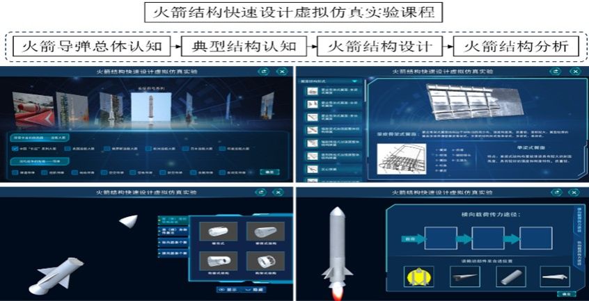 课程简介:《火箭结构快速设计虚拟仿真实验》是为了在教学过程中让学生更直观的了解火箭结构设计之美,改变以往的纸上谈兵式教学,解决学生在学习中完全依靠想象、教学效率极低、学生接收难度极大等痛点问题。课程教学团队认真审视新时代背景下航天专业实践课程的价值取向,依托虚拟仿真技术和创新科技项目协同驱动,以需求为导向,突出应用驱动、交叉融合、开放共享的特色来建设。实验项目分为四大模块:火箭导弹总体认知、典型结构认知、火箭结构设计和火箭结构分析。在实验过程中,让学生亲身体验从理论知识学习到结构设计虚拟实验验证的全过程,做到让学生“有兴趣学”、“能主动学”、“动脑子学”,实现“寓教于乐”,激发学生的学习兴趣。本虚拟仿真实验也同时作为蕾丝视频