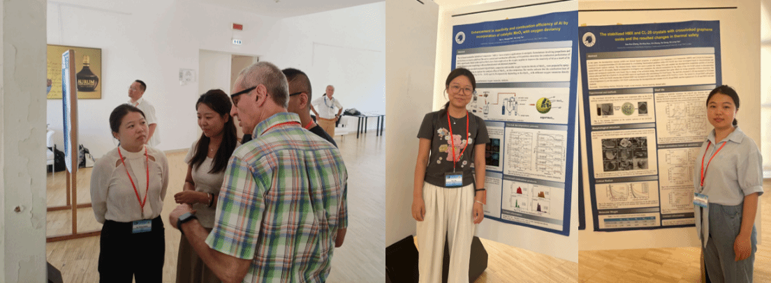 空天能源技术研究所研究生代表在本次会议中也积极展示了优秀的科研成果。在海报展示和交流环节,博士生代表张雪雪展示了题为“The stabilized HMX and CL-20 crystals with crosslinked graphene oxide and the resulted changes in thermal safety”的研究成果,阐述了碳基二维聚合物材料对于HMX和CL-20晶体的稳定化效应;硕士生代表李欣展示了题为“Enhancement in reactivity and combustion efficiency of Al by incorporation of catalytic MoO3 with oxygen deviancy”的研究成果,分享了含有氧缺陷金属氧化物对于铝基复合物反应活性和燃烧效率的增强作用,她们在海报交流环节与其他与会学者们进行了充分的交流探讨。