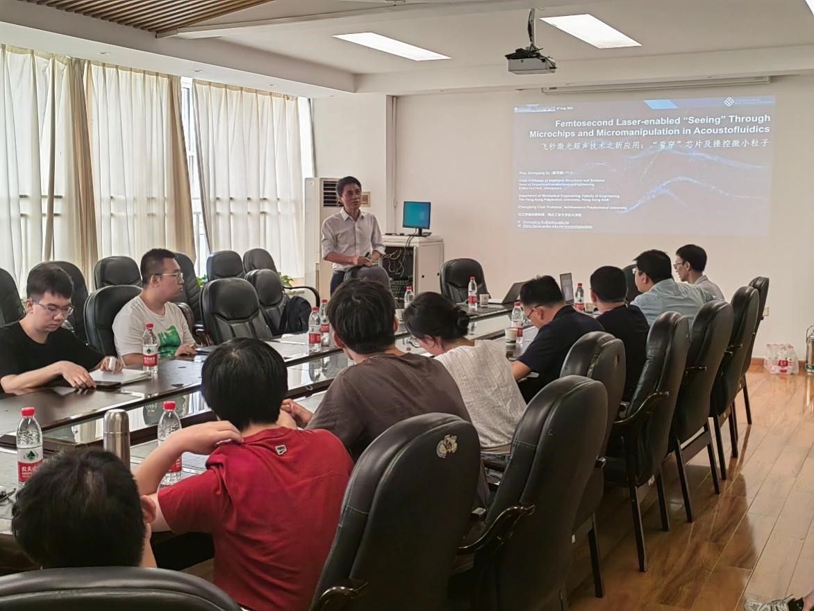 师生来带了《飞秒激光超声技术之新应用:“看穿”芯片及操控微小粒子》的学术讲座,介绍了香港理工大学在飞秒激光技术方面的突破性进展,为光声耦合提供了新的视角,开辟了令人兴奋的应用前景。苏教授详细讲解了基于超快激光超声的无损评估新框架,通过利用飞秒激光产生的超声波,实现了纳米尺度上的超高分辨率材料表征。通过对具有高度各向异性的单晶半导体晶片及不透明堆叠微系统的内部特征进行三维成像,该方法从基本理论到实现细节均得到了实验验证。此外,苏教授还分享了超快激光在皮秒声流学研究中的新应用范例,其中包括一种综合了光声镊和声镊优点的光声镊技术。通过瞬态热弹性耦合,脉冲超快激光通过液体照射衬底,触发环形传播光声波并产生声辐射力,用于操纵液体中的微小颗粒。这种以非接触方式进行的方法为超微结构的损伤监测开辟了新的思路和方向。