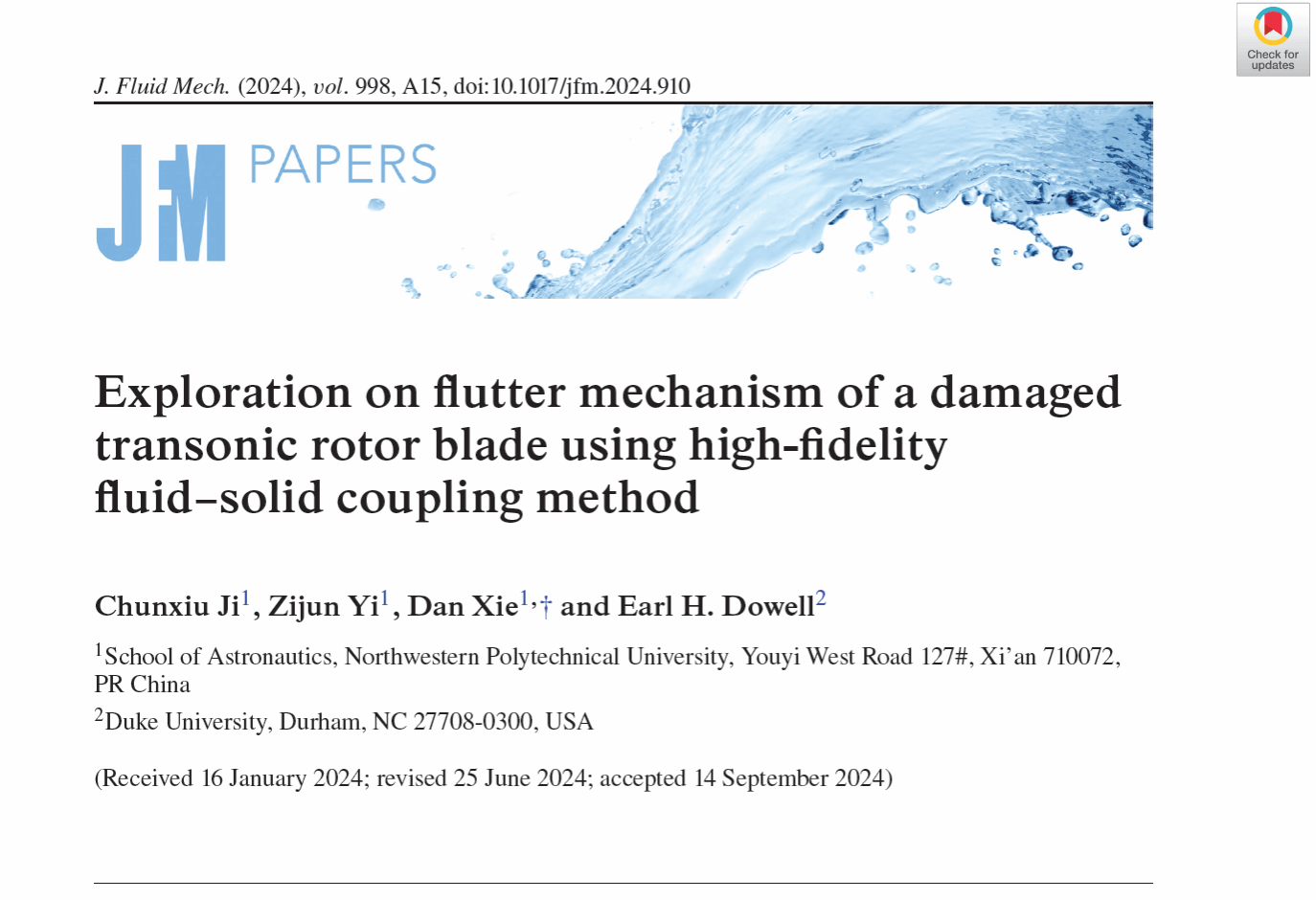 谢丹教授团队在发动机转子损伤叶片颤振机理研究上取得重要进展。研究成果以“Exploration on flutter mechanism of a damaged transonic rotor blade using high-fidelity fluid–solid coupling method”为题发表在由英国剑桥大学George K. Batchelor创办的流体力学国际顶级期刊《Journal of Fluid Mechanics》上(//doi.org/10.1017/jfm.2024.910)。谢丹教授是论文的唯一通讯作者,博士生冀春秀为第一作者,杜克大学Dowell教授为合作者。该研究得到了国家自然科学基金面上项目、国家自然科学基金国际(地区)合作交流项目资助。