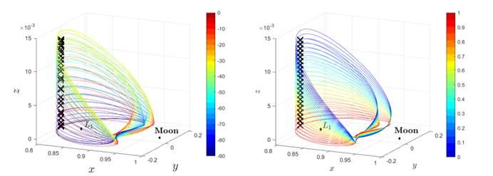 4、利用平动点轨道的动力学特性,提出了脉冲微分控制方法和动力学模态重塑控制方法等两种小推力保持方法,具有对轨道误差鲁棒性和燃料消耗低的优点。