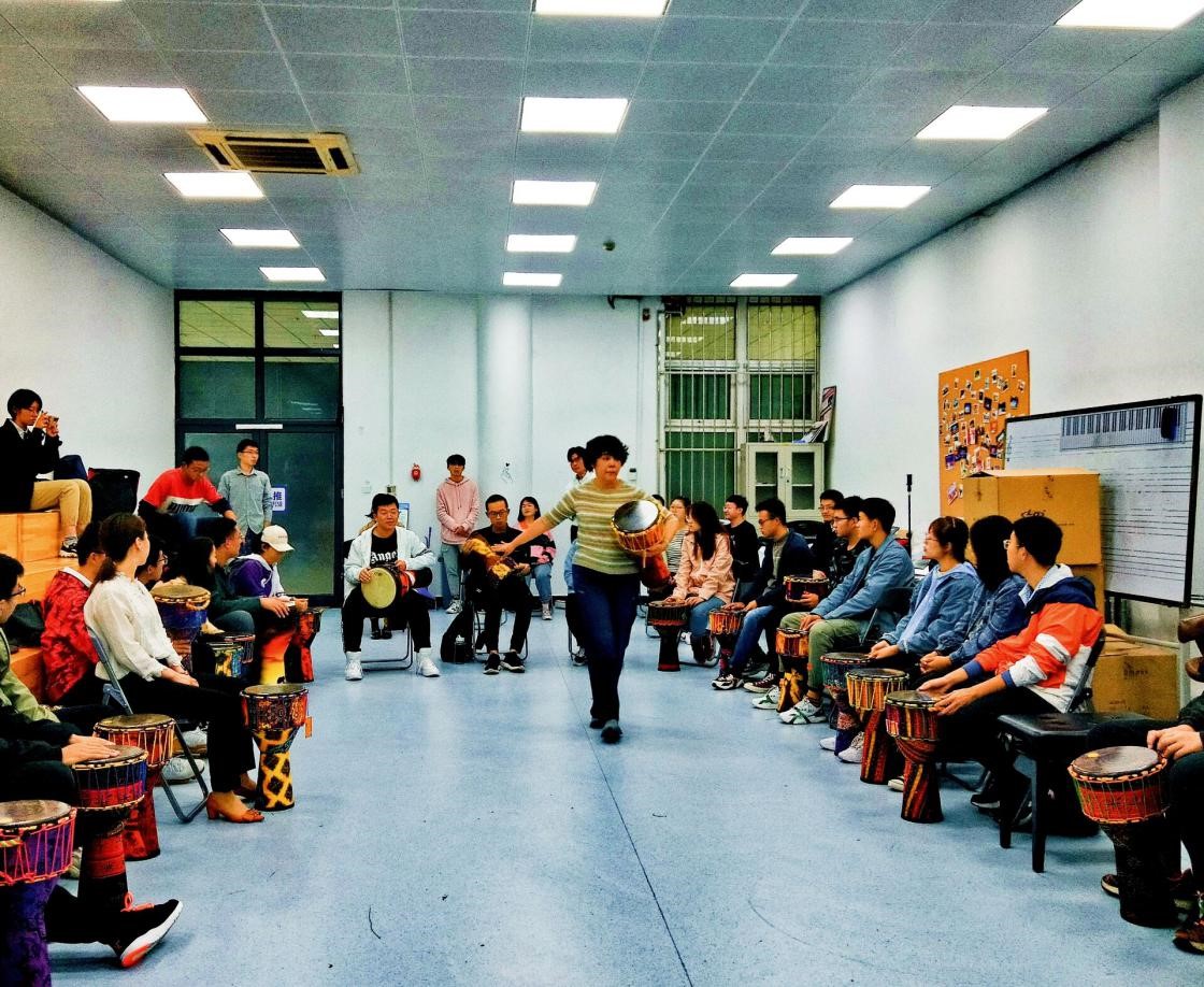 金焰老师将同学们围成坐一圈,让大家一边自我介绍,一边随心敲鼓,用韵律的节拍展示自己。鼓声配合着同学们欢快的话语,让现场的气氛逐渐热烈起来。